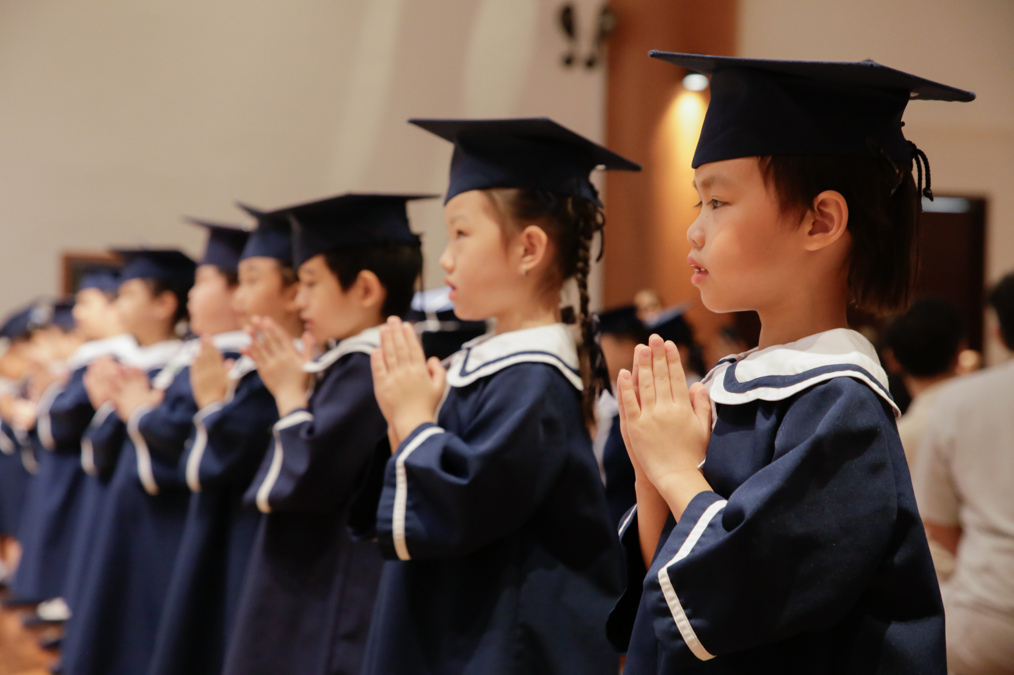 《无量法门》音乐一响,三所慈济大爱幼教中心的毕业生穿着整齐的毕业袍,头带四方帽,庄重而认真地从佛堂两侧步入会场。